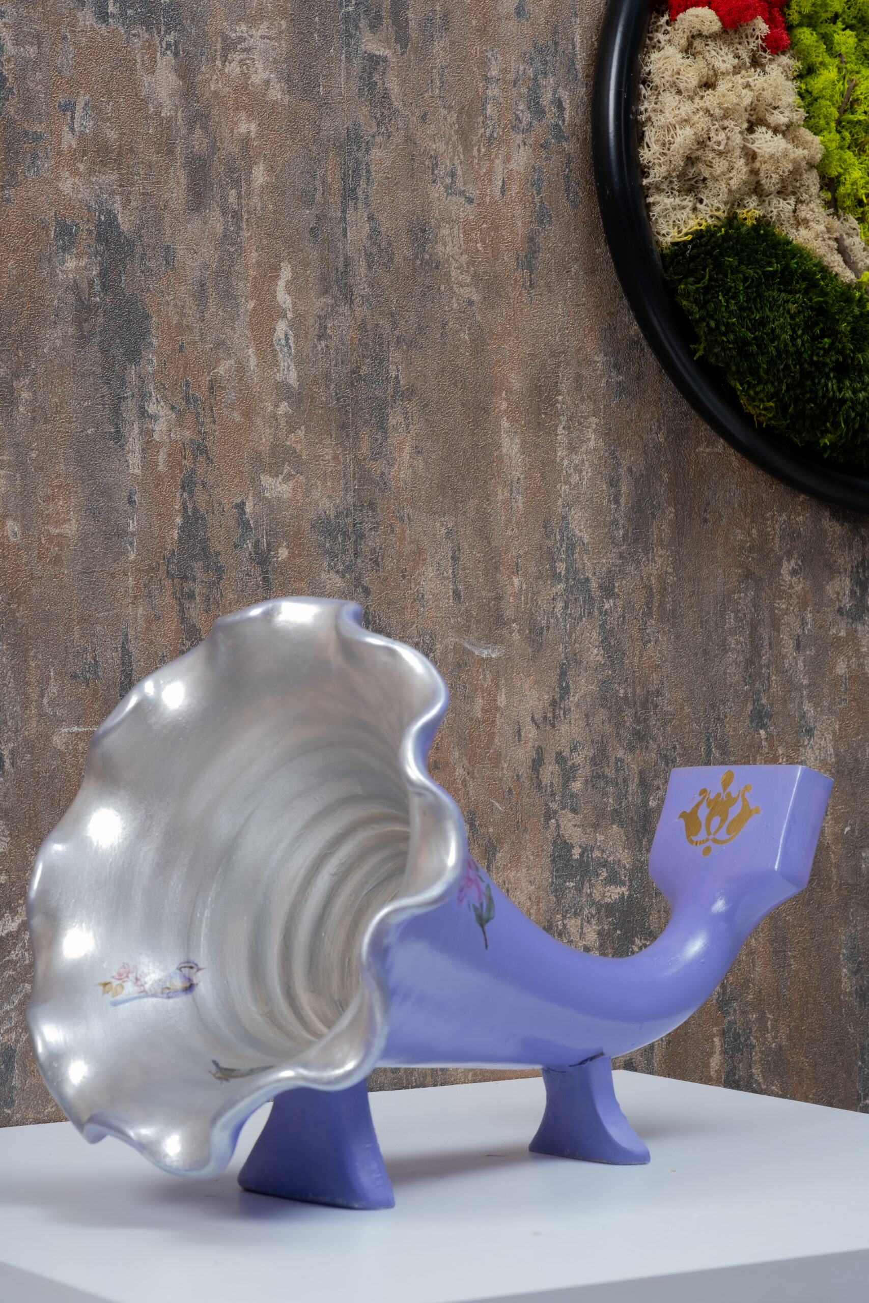 Mor gövdesi ve iç yüzeyindeki metalik gümüş dalga yapısı, sesi yönlendirerek daha yüksek ve temiz bir tını elde edilmesini sağlar. Elektrik gerektirmeden çalışan yapısı sayesinde masa, konsol, ofis ve ev ortamlarında hem dekoratif bir obje hem de fonksiyonel bir aksesuar olarak kullanılabilir.