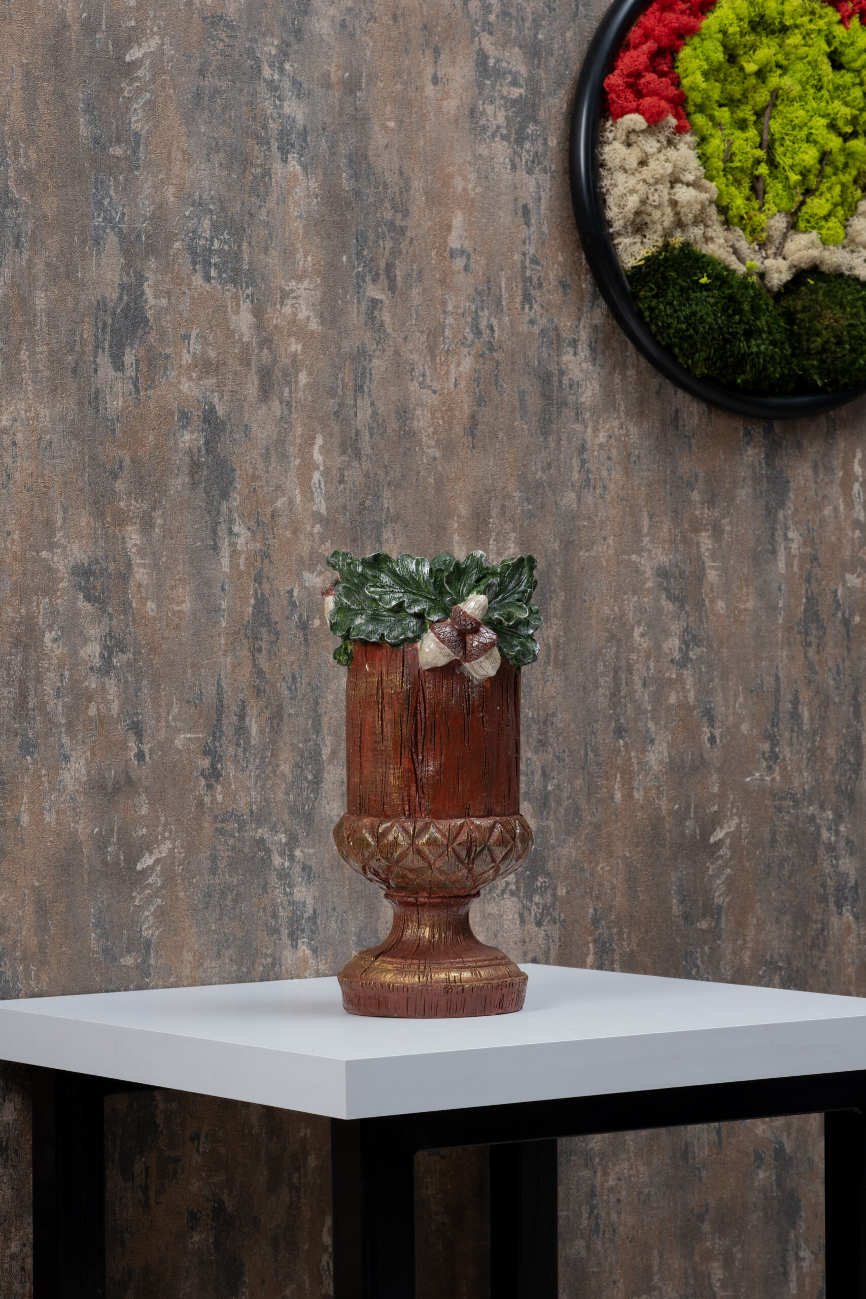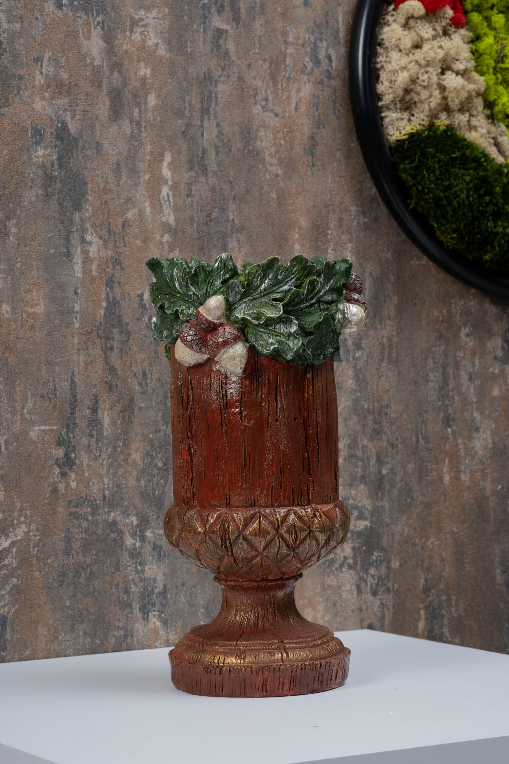 Doğanın sıcak tonlarından ilham alan Forest Crown Pedestal Vase, kabuk dokulu gövdesi ve üst bölümünü çevreleyen detaylı yaprak–meşe palamudu motifleriyle rustik bir estetik sunar. Polyester malzemeye verilen el işçiliği efektleri, ürünü ahşap görünümünde sanatsal bir dekor parçasına dönüştürür.