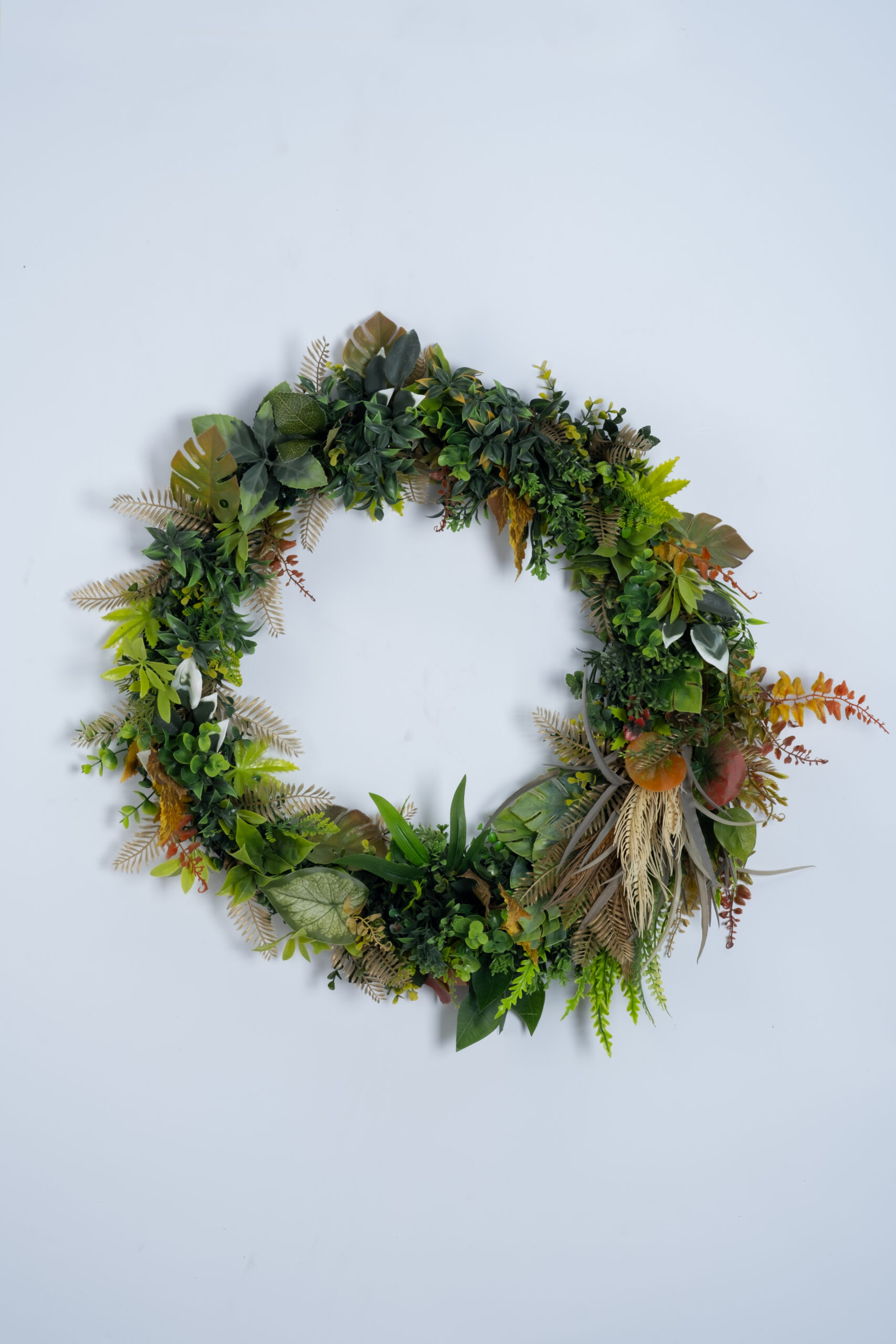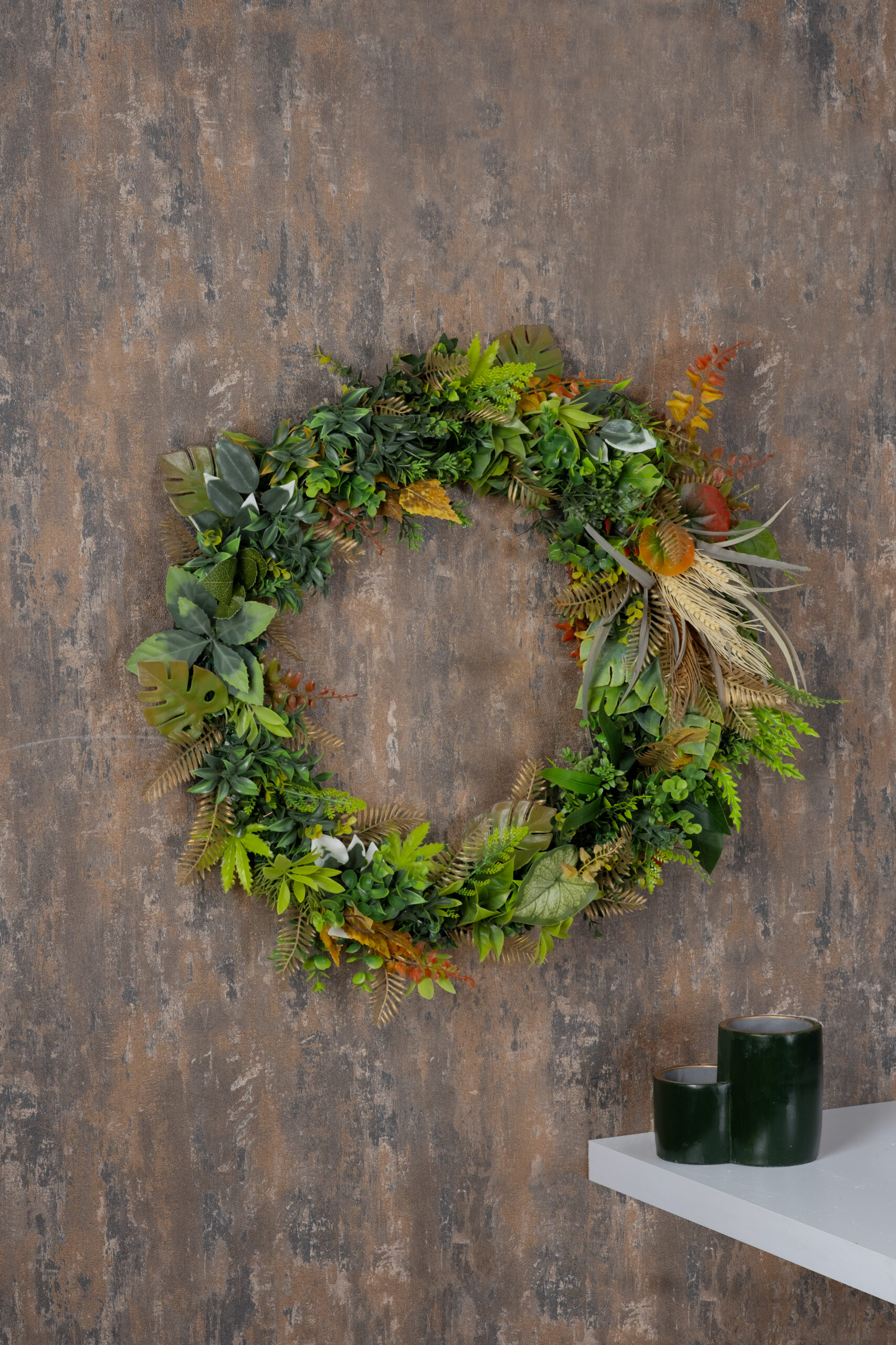 Forest Harmony Wreath, çeşitli yaprak dokuları ve doğadan ilham alan tonları bir araya getirerek her mekâna doğal ve ferah bir atmosfer katar. Zengin yeşil yaprakların, tropik dokuların ve hafif kurutulmuş bitki efektlerinin birleşimiyle oluşturulan bu dekoratif çember; kapı, duvar veya vitrinlerde dört mevsim kullanılabilir şık bir tamamlayıcıdır.