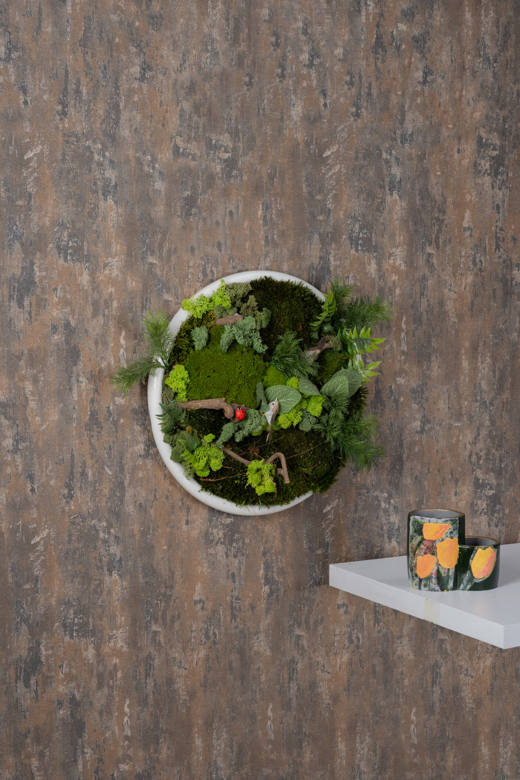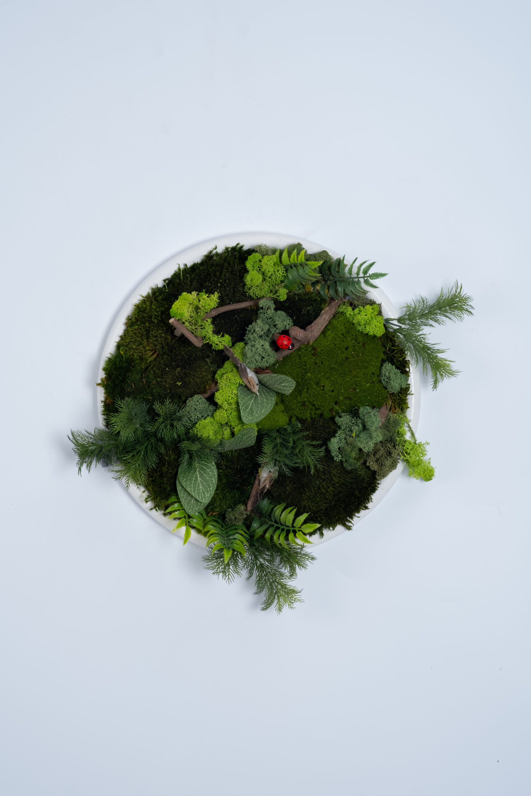 Doğanın minyatür bir sahnesini duvara taşıyan Forest Whisper Ladybug Terrarium Frame, farklı tonlardaki doğal yosunlar, minik dal parçaları ve taze yeşil bitki dokularıyla zengin bir orman kompozisyonu sunar.