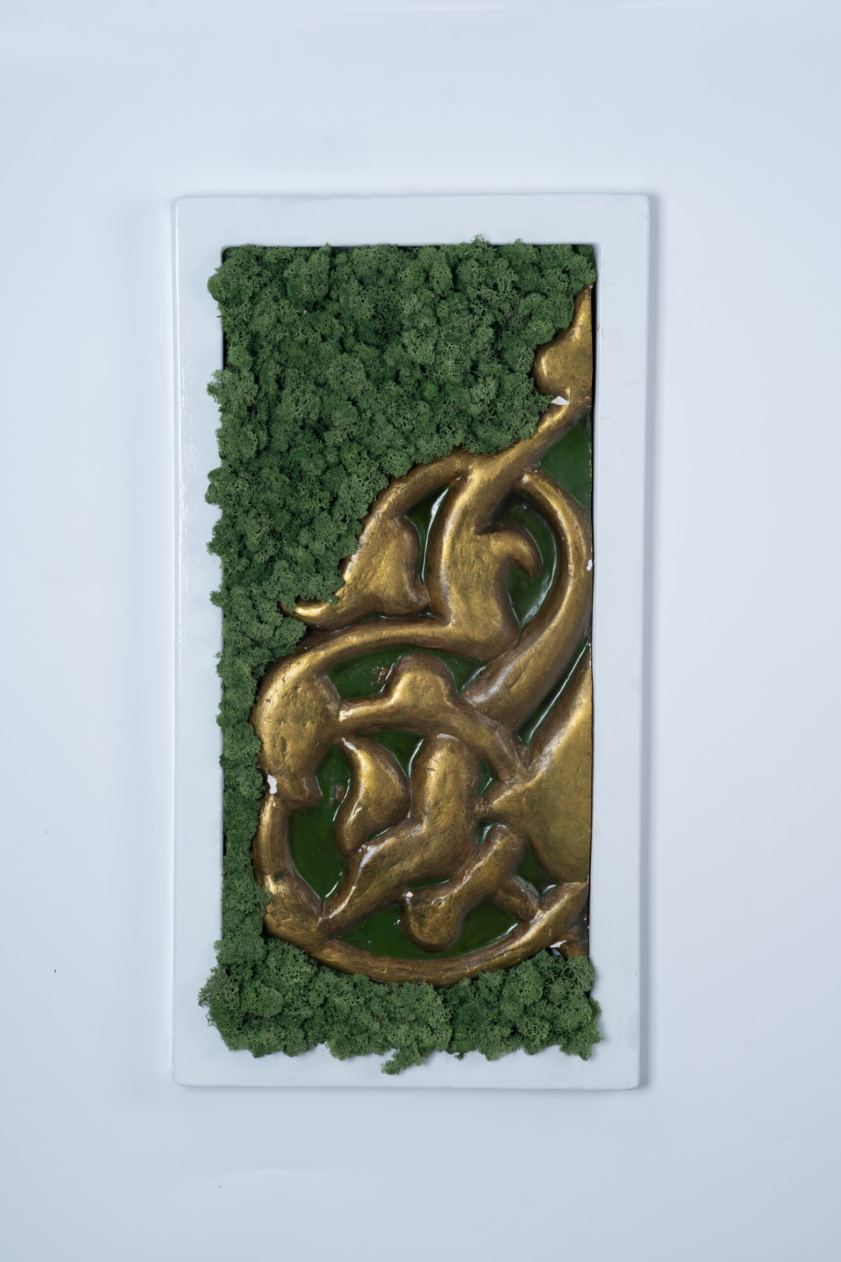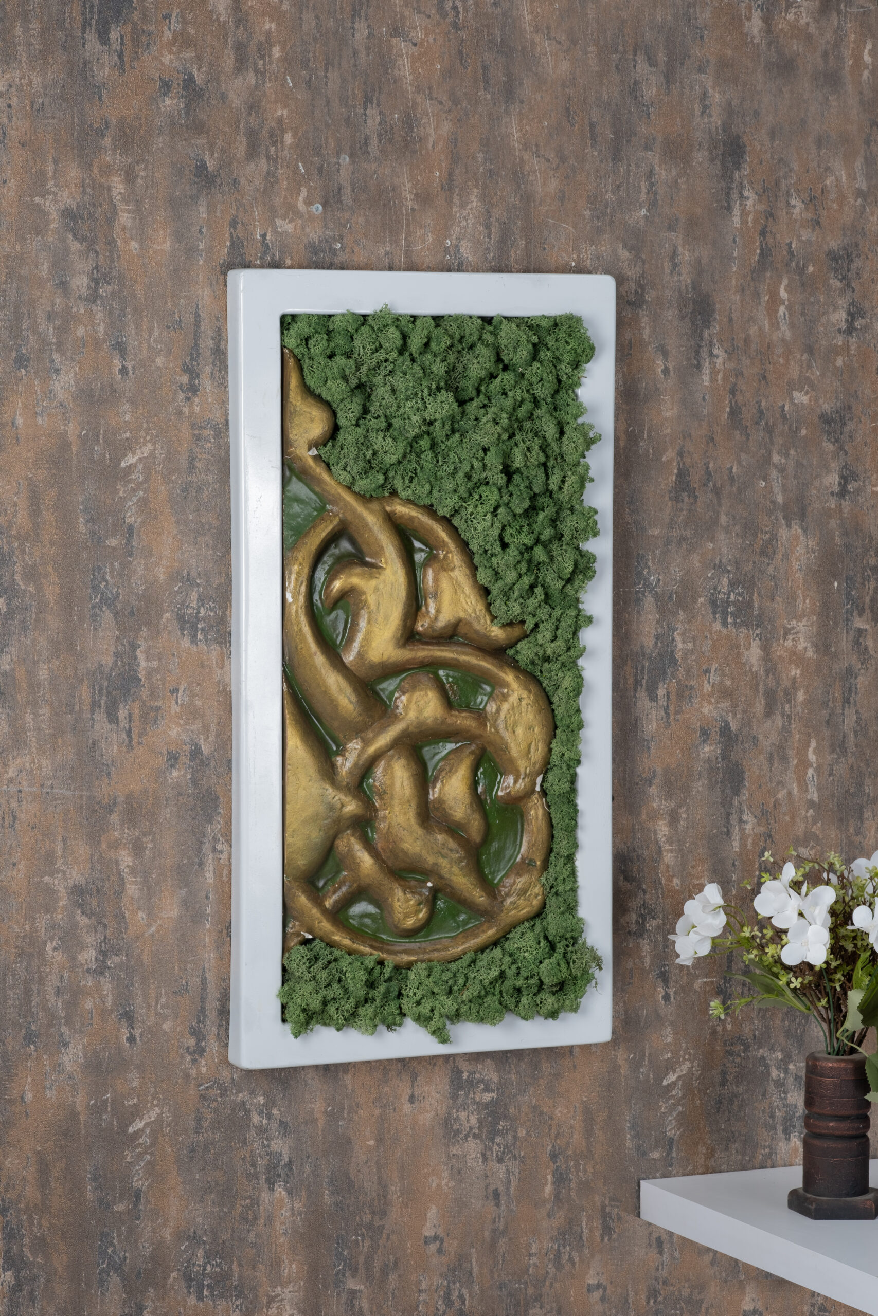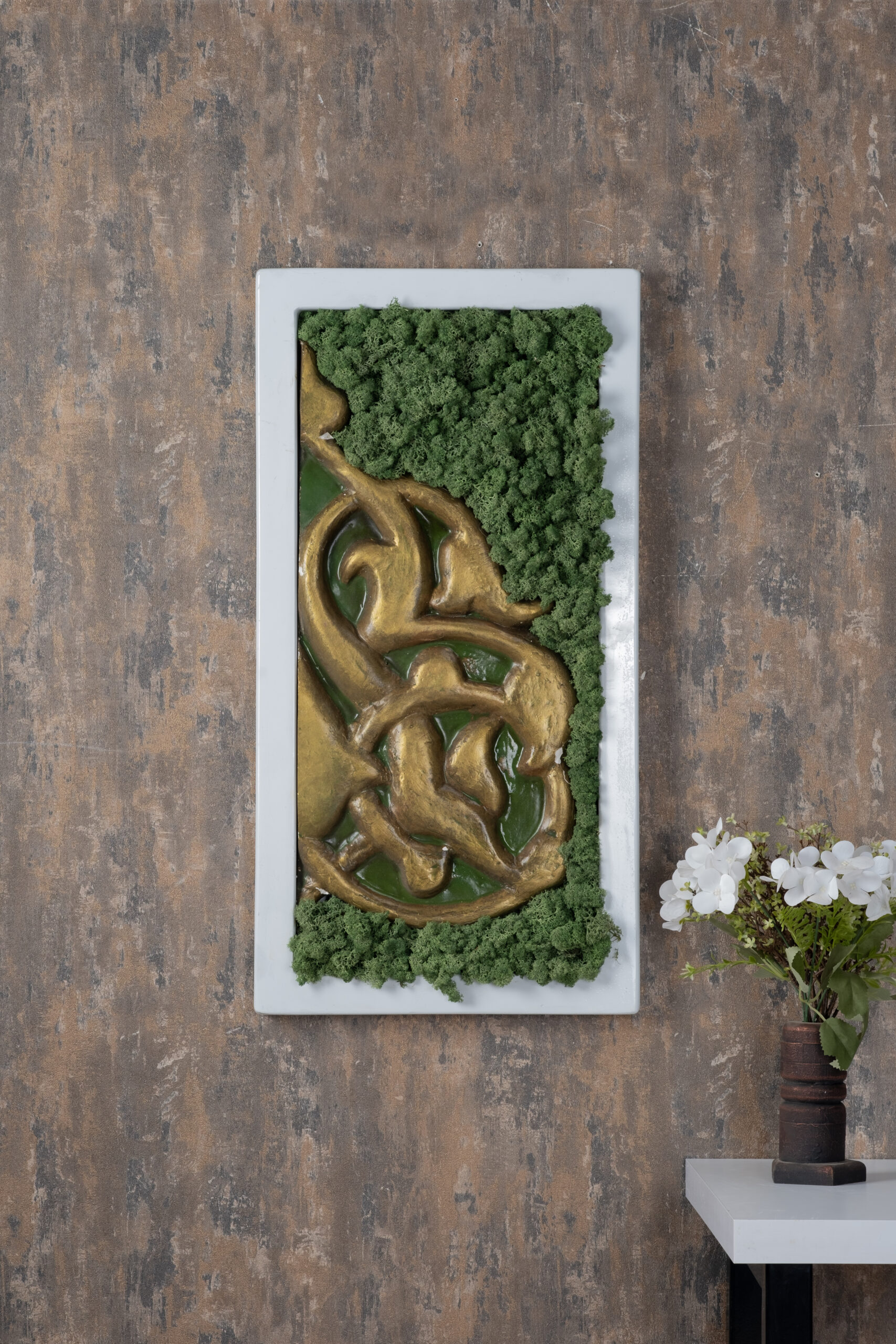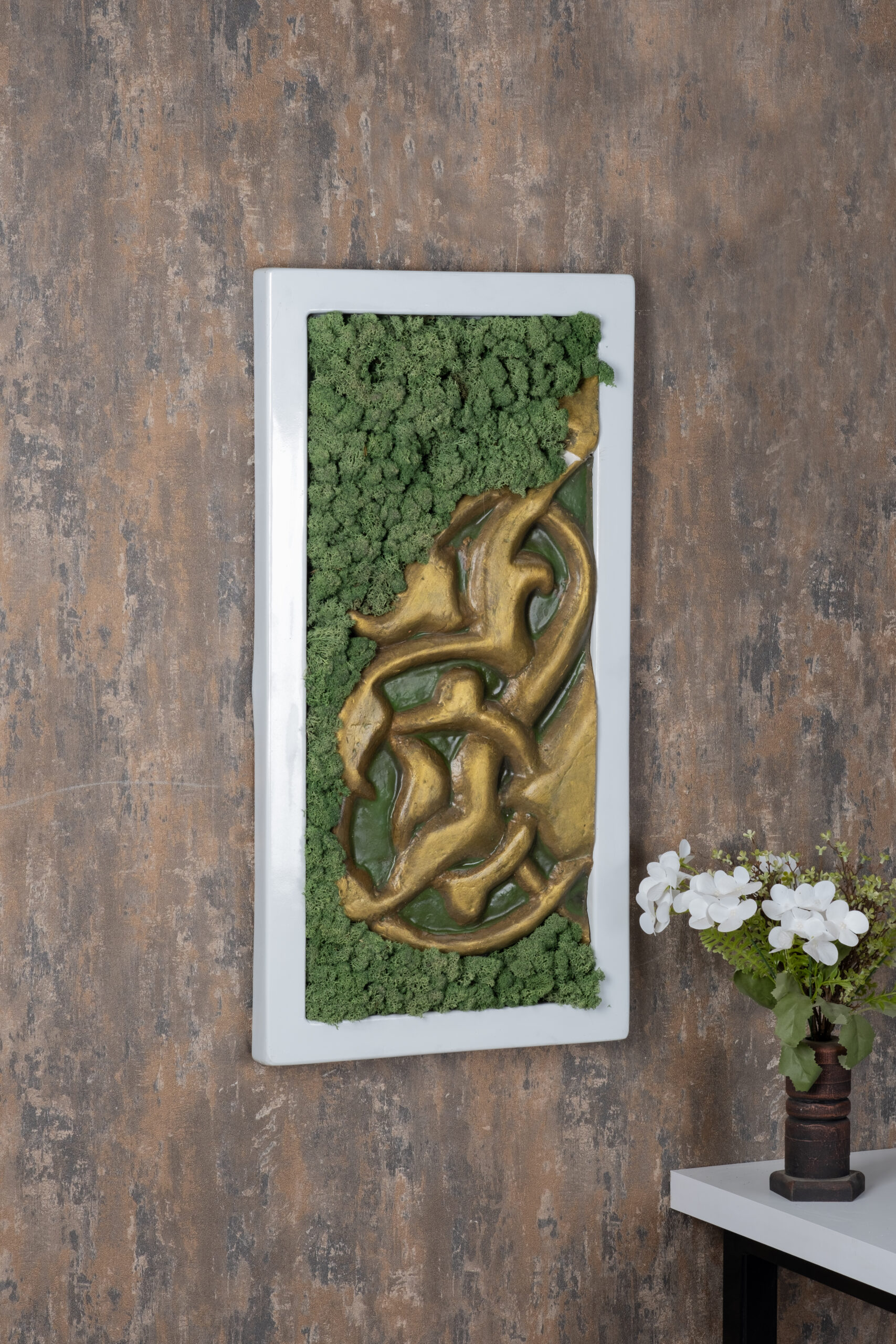 Golden Moss Frame, doğal yosunların yumuşak dokusu ile altın tonlu kabartma tasarımın birleştiği şık ve modern bir dekor parçasıdır. Beyaz çerçevesi içerisinde yer alan altın form, sanat ve doğayı aynı yüzeyde buluşturarak dikkat çeken bir estetik sunar.