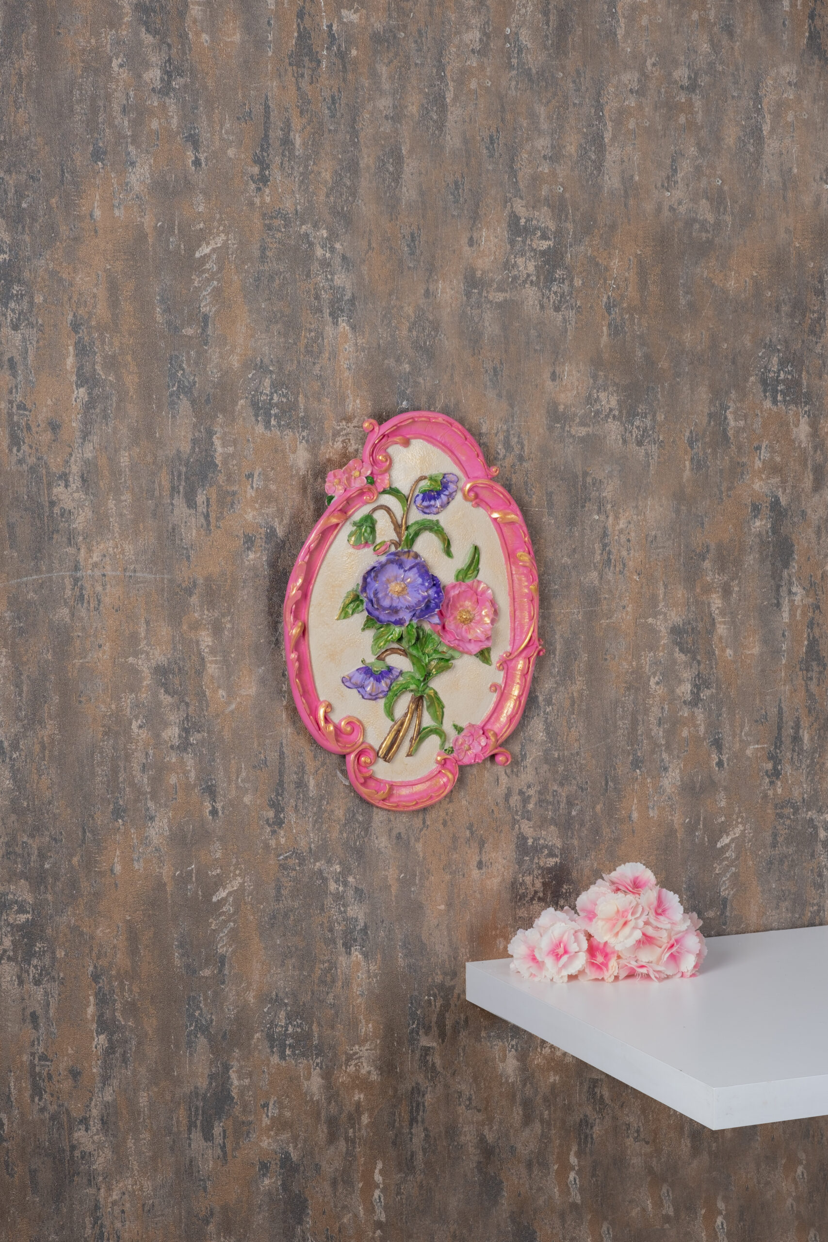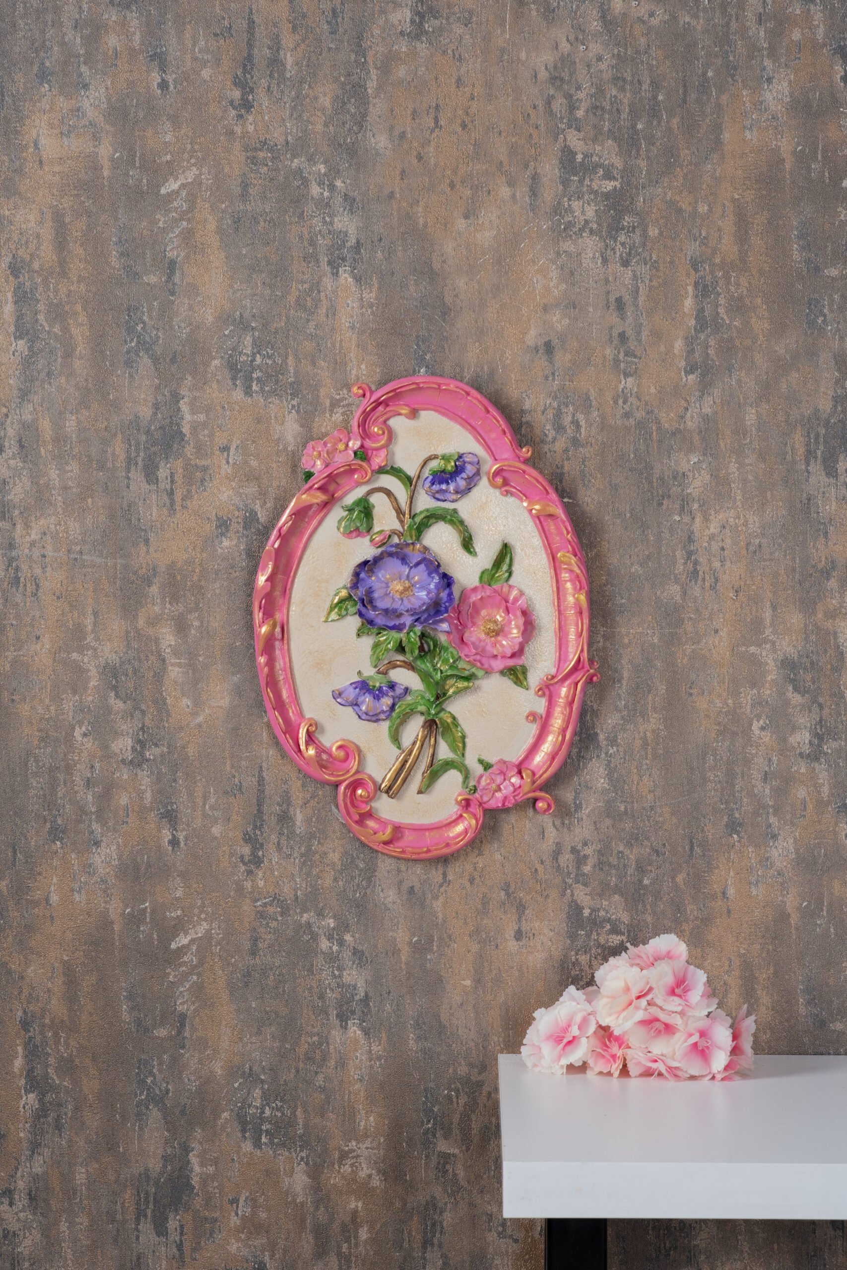 Zarif çiçek motiflerinin üç boyutlu dokusuyla öne çıkan Royal Bloom Wall Frame, romantik ve klasik dekorasyon sevenler için göz alıcı bir duvar aksesuarıdır. Canlı pembe çerçevesi ve detaylı altın işlemeleri, eserin nostaljik bir sanat parçası gibi görünmesini sağlar.