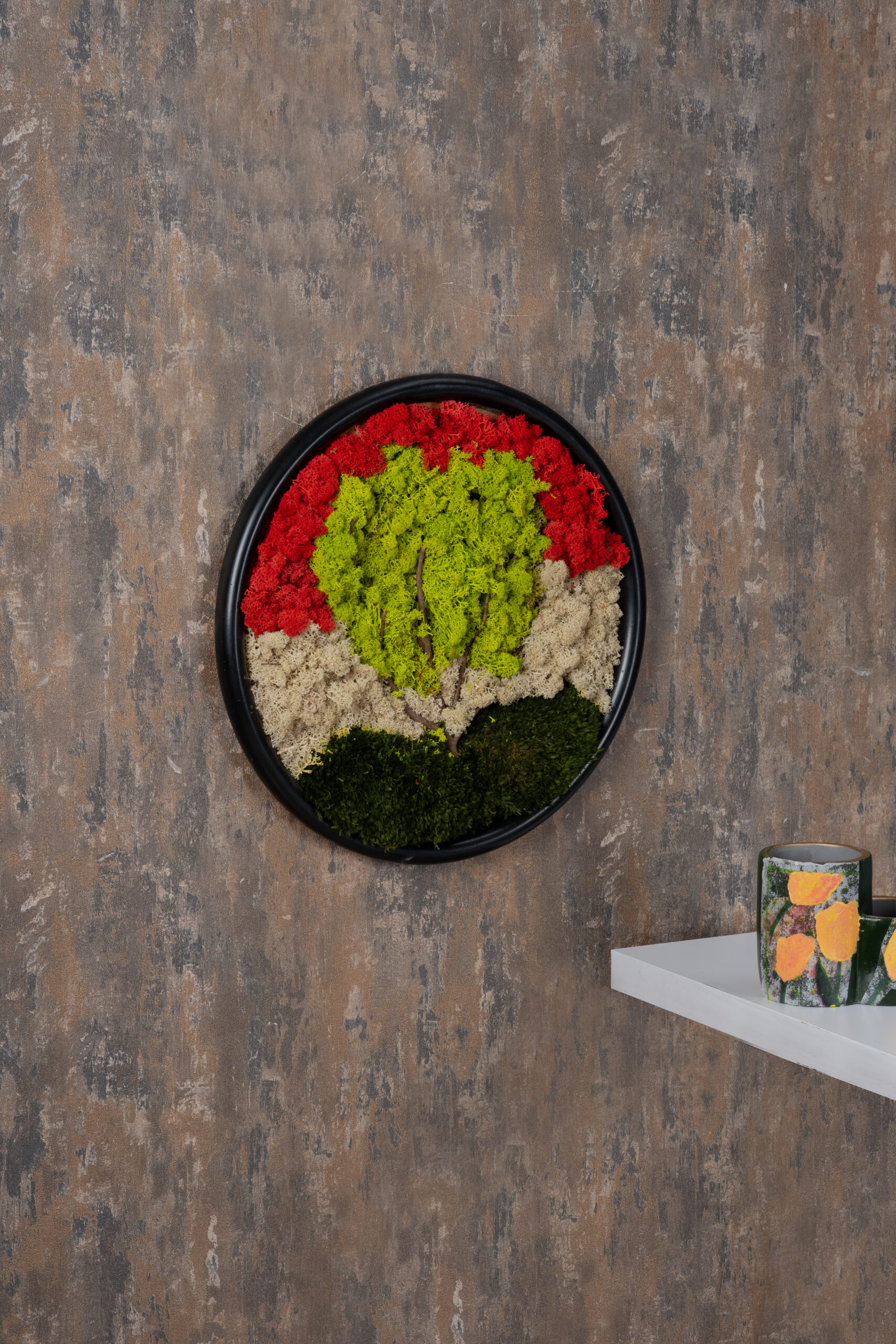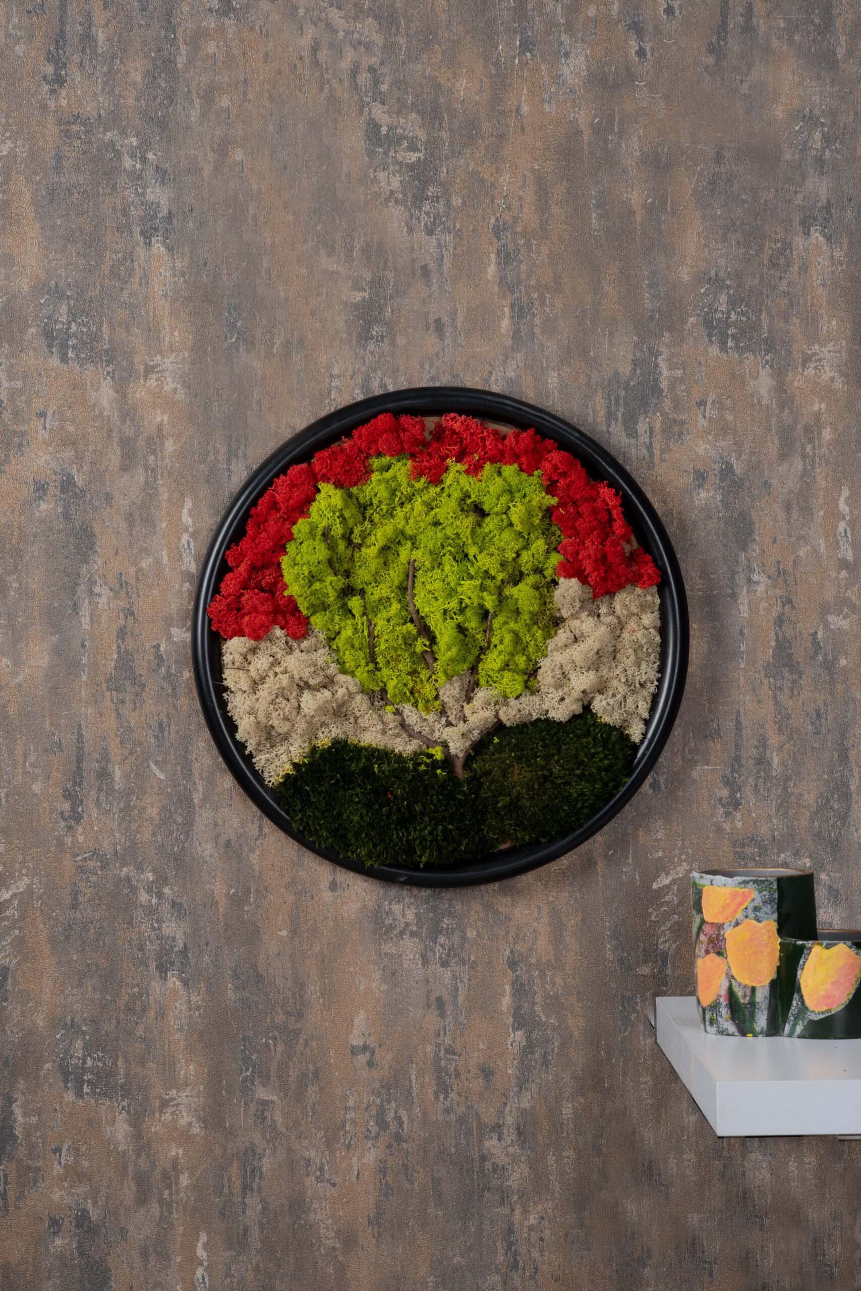Doğanın dört mevsimini tek bir kompozisyonda buluşturan Seasons of Life Moss Art, doğal yosunların farklı renk tonlarıyla oluşturulmuş ağaç silueti sayesinde duvarda etkileyici bir sanat eseri görünümü yaratır. Kırmızı, açık bej, zeytin yeşili ve koyu yeşil moss dokuları, mevsim geçişlerini simgeleyen canlı bir perspektif oluşturur.