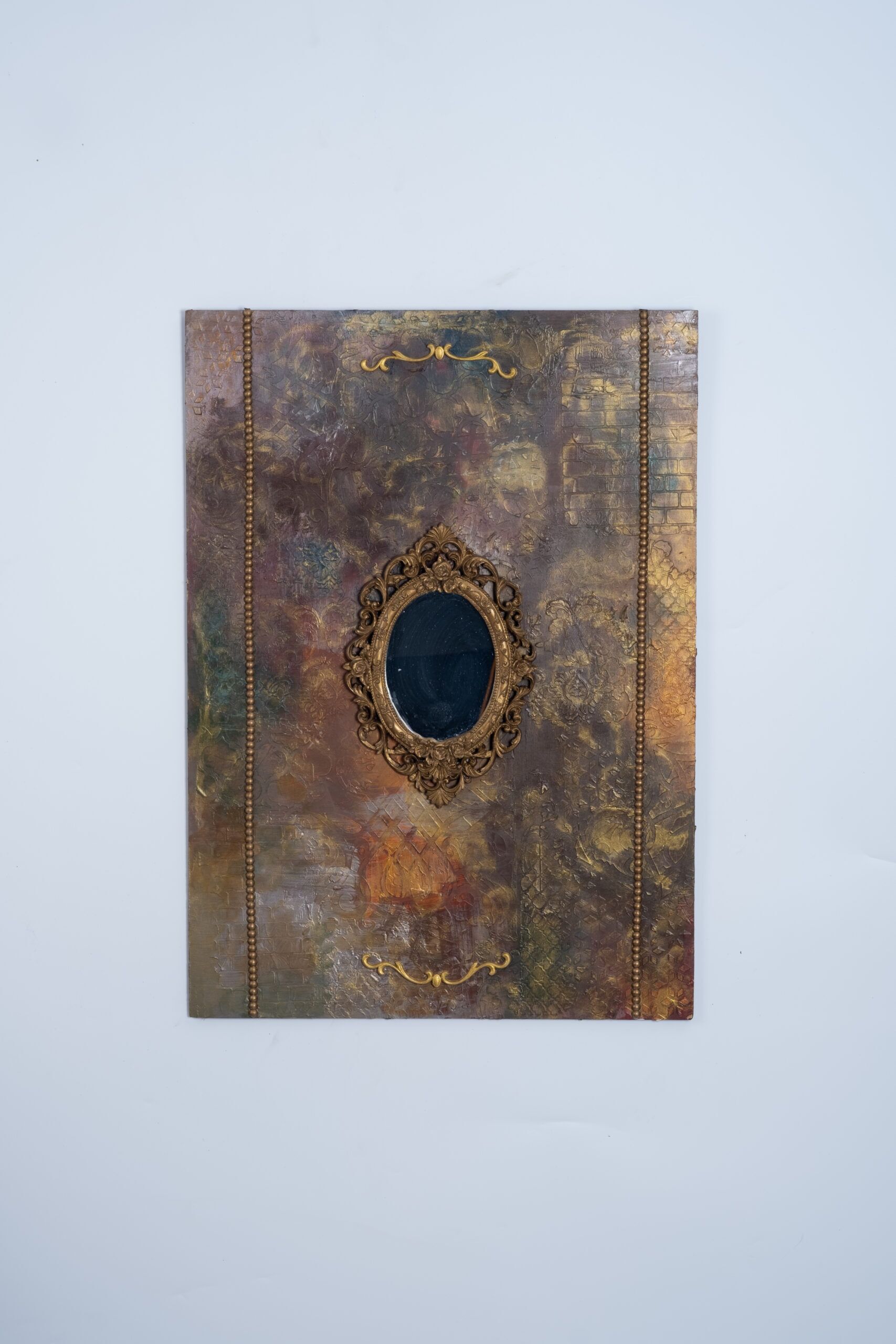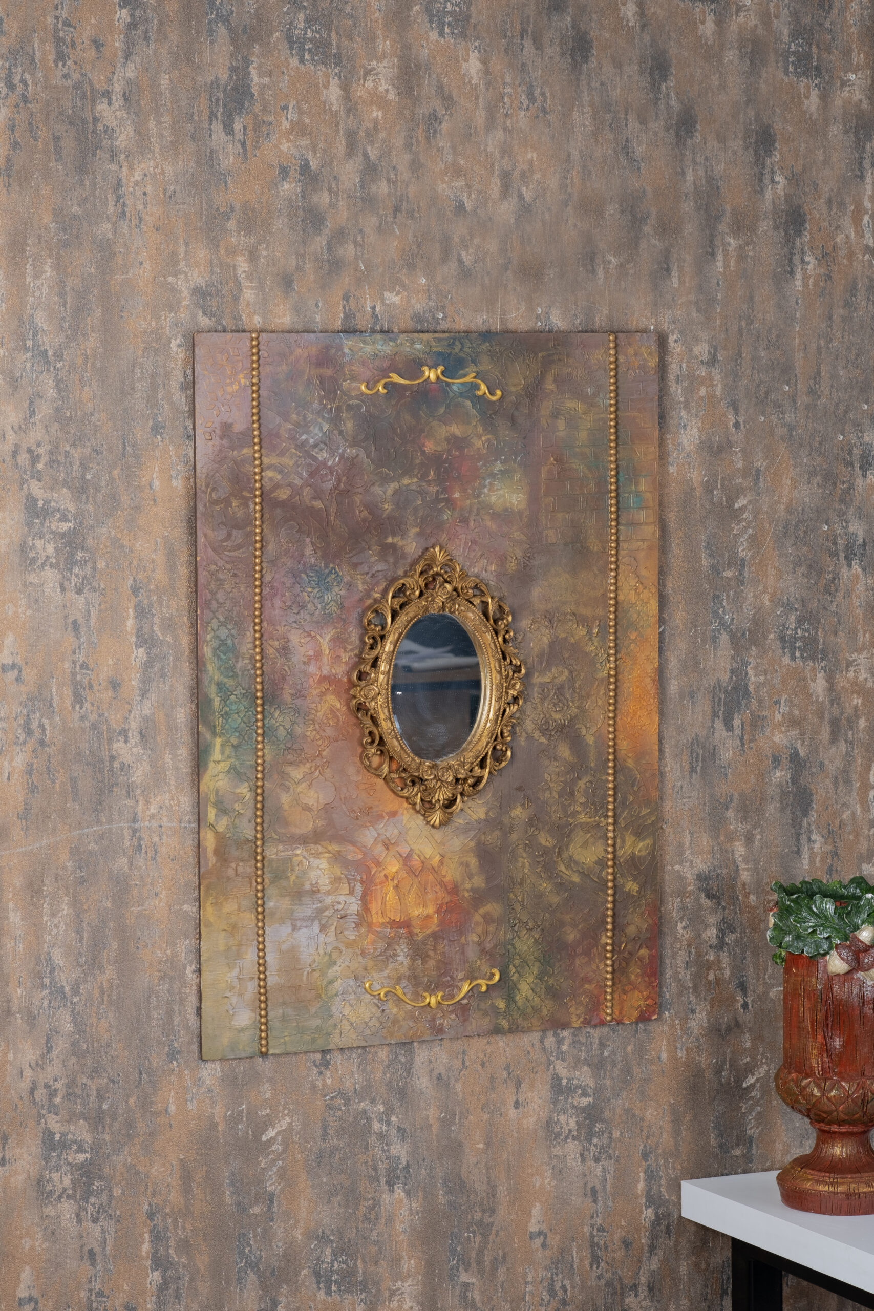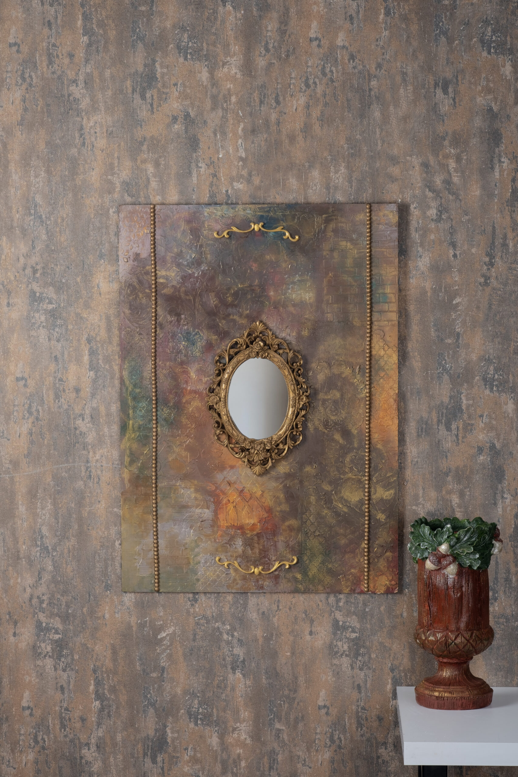 Vintage Mirror Art Panel, eskitme dokuların ve altın detayların birleşimiyle oluşturulmuş sanatsal bir dekor panosudur. Orta bölümdeki kabartmalı klasik çerçeve içinde yer alan küçük ayna, panele hem nostaljik hem de sofistike bir hava kazandırır.