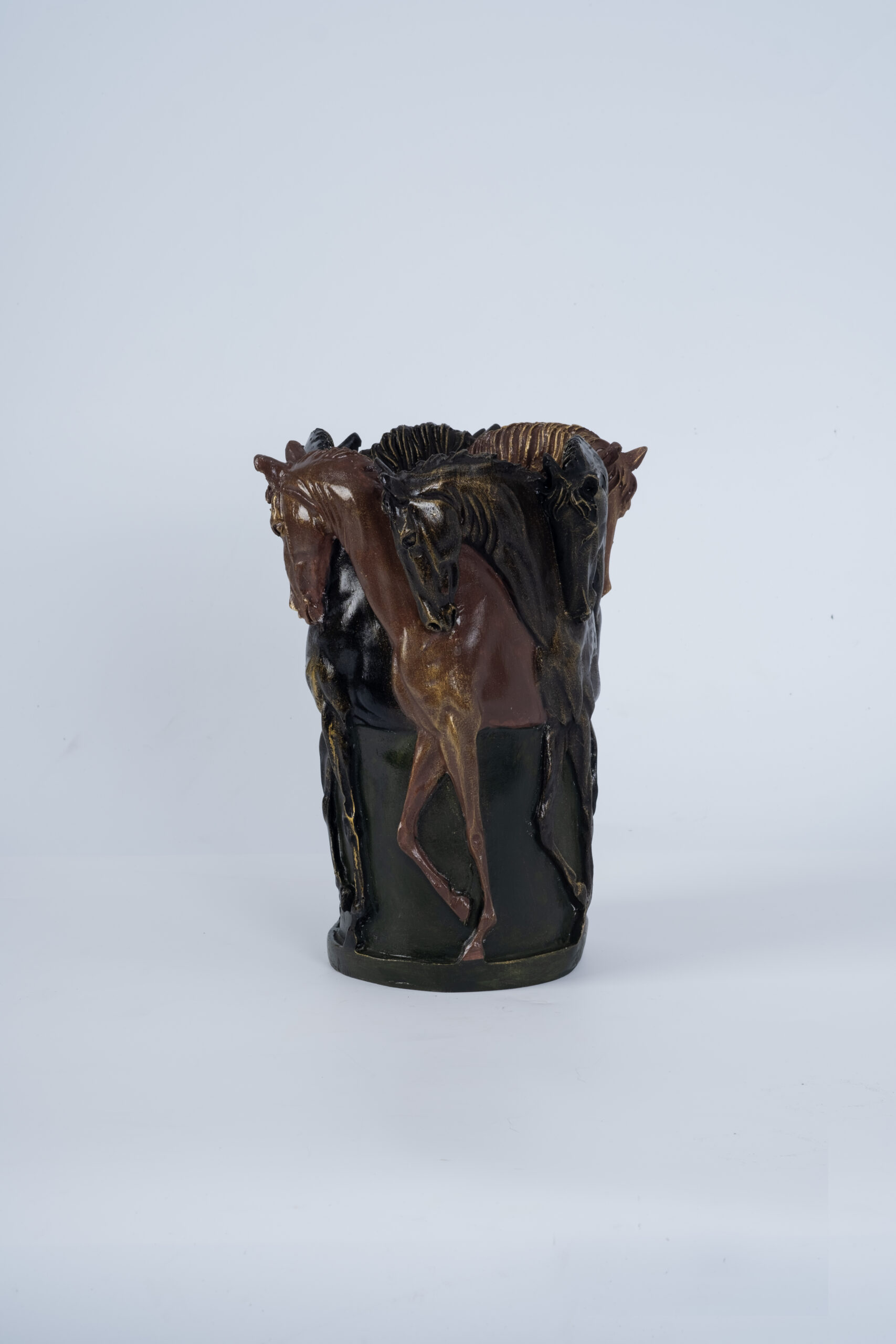 Koşunun özgürlüğünü ve atların asil duruşunu yansıtan Wild Run Horse Vase, gövdesini tamamen çevreleyen heykelsi at figürleriyle dikkat çeker. Parlak dokulu polyester yüzey, koyu zemine işlenen çok katmanlı at detaylarıyla güçlü bir kontrast oluşturur.